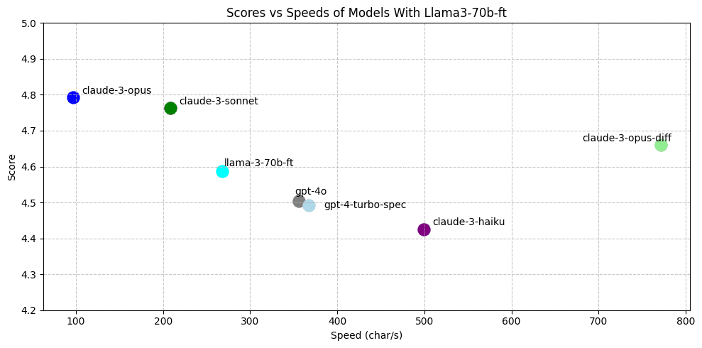 We find that our best model (llama-3-70b-ft) almost matches claude-3-opus-diff and outperforms gpt-4-turbo and gpt-4o.