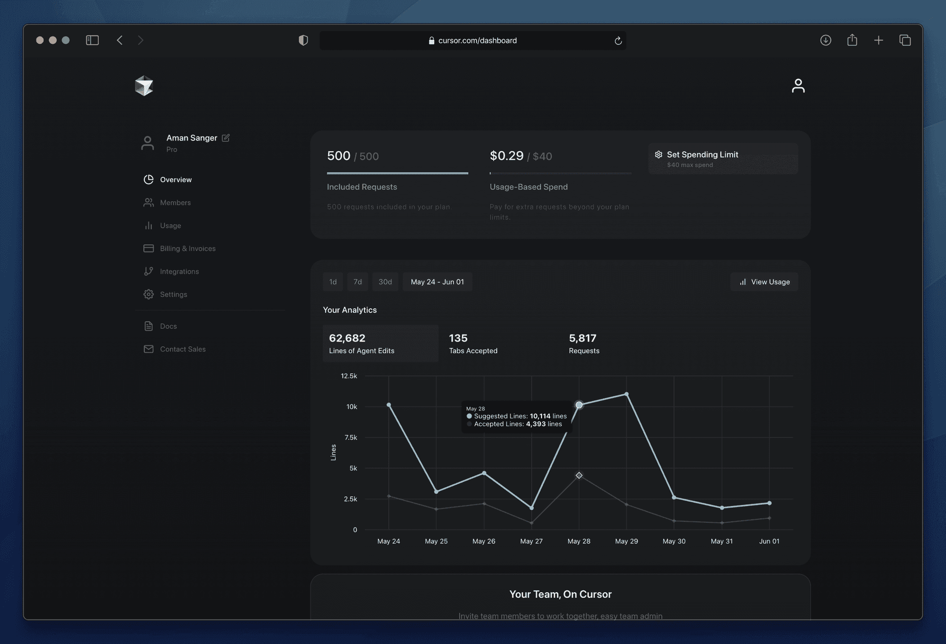 With the new Dashboard, you can view your individual or team's usage analytics, update your display name, and view detailed statistics broken down by tool or model.