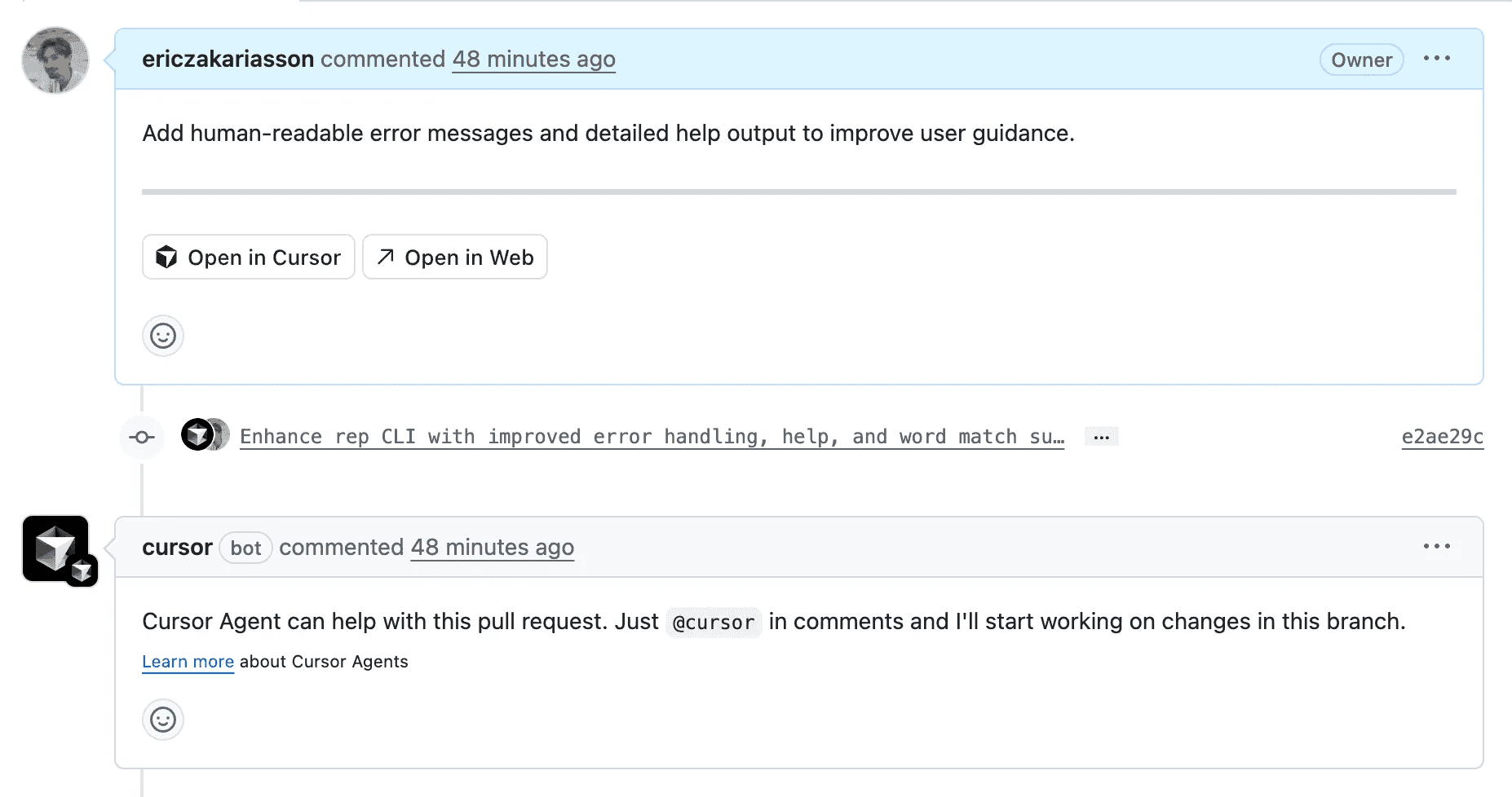 Agents can now be used directly inside GitHub pull requests. Tag @Cursor and the Agent will read the prompt, apply the fix, and push a commit.